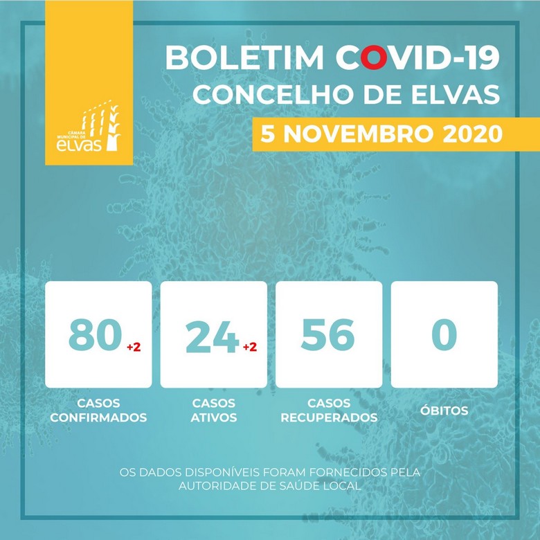 A evolução pandémica no concelho de Elvas ao dia 4 de Novembro apresenta 80 casos confirmados desde o início da pandemia, 56 estão curados e não houve nenhum óbito a lamentar.