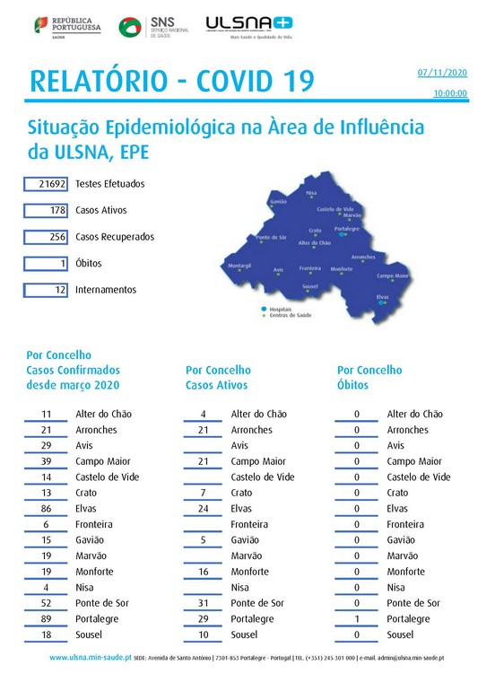 No distrito de Portalegre existem 178 casos activos de Covid-19, segundo o relatório diário da Unidade Local de Saúde do Norte Alentejano (ULSNA).