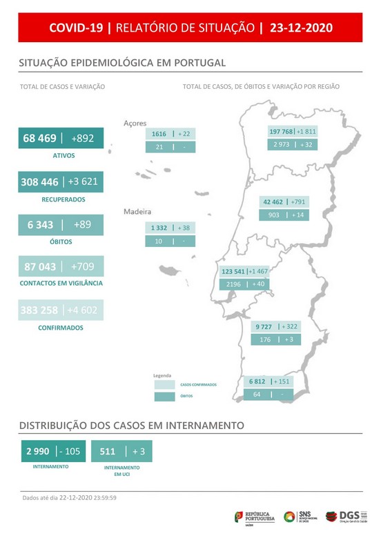 Desde o início da pandemia, Portugal já registou 6.343 mortes e 383.258 casos de infeção pelo vírus SARS-CoV-2, estando hoje ativos 68.469, mais 892 do que na terça-feira.
