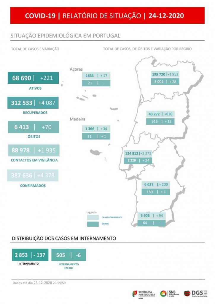 Desde o início da pandemia, Portugal já registou 6.413 mortes e 387.636 casos de infeção pelo vírus SARS-CoV-2, estando hoje ativos 68.690, mais 221 do que na quarta-feira.