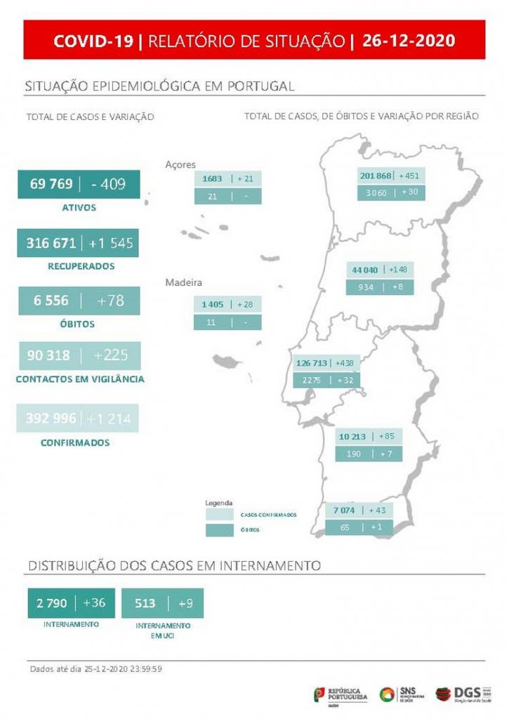 Desde o início da pandemia, Portugal já registou 6.556 mortes e 392.996 casos de infeção pelo vírus SARS-CoV-2, estando hoje ativos 69.769, menos 409 do que na sexta-feira.