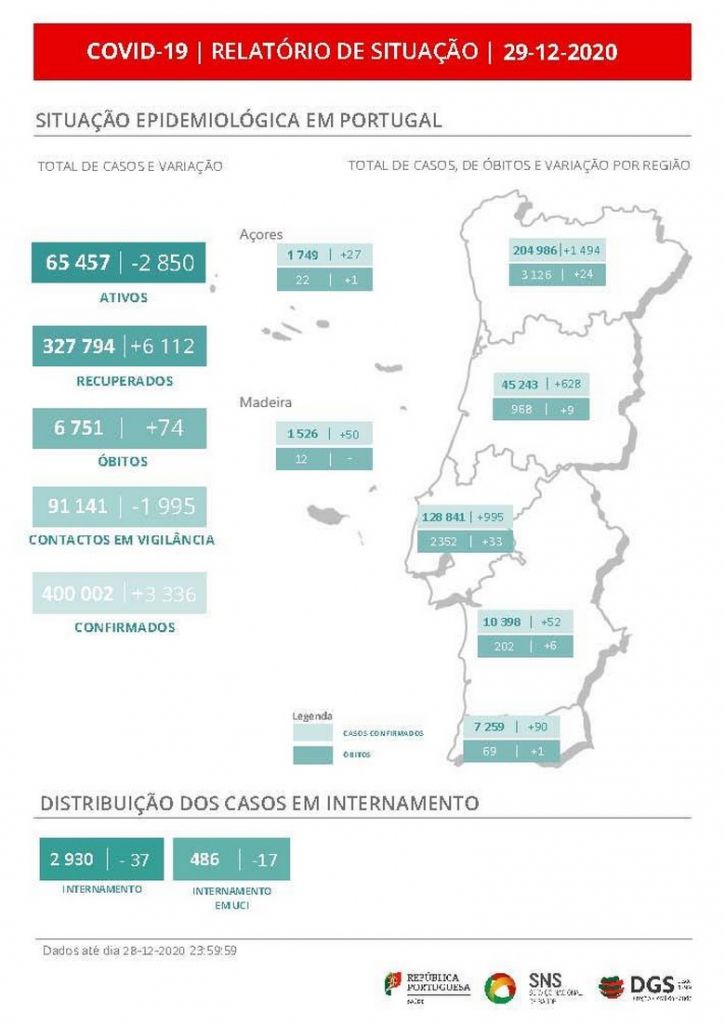 Desde o início da pandemia, Portugal já registou 6.751 mortes e 400.002 casos de infeção pelo vírus SARS-CoV-2, estando hoje ativos 65.457, menos 2.850 do que na segunda-feira.