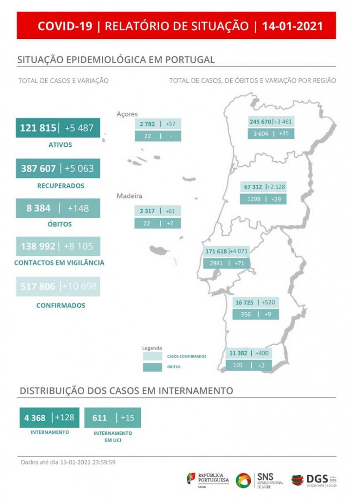 Desde o início da pandemia, em março de 2020, Portugal já registou 8.384 mortes associadas à covid-19 e 517.806 casos de infeção pelo vírus SARS-CoV-2, estando hoje ativos 121.815 casos, mais 5.487 do que na quarta-feira.