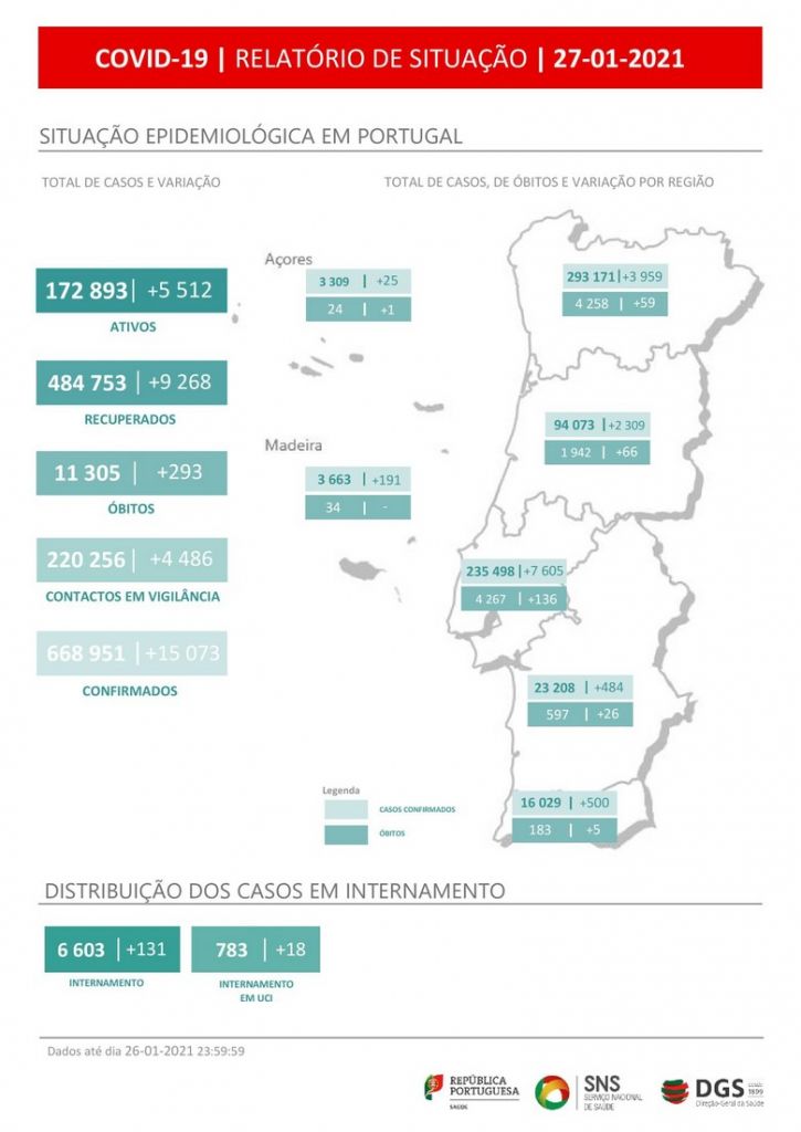 Desde o início da pandemia, Portugal já registou 11.305 mortes associadas à covid-19 e 668.951 casos de infeção pelo vírus SARS-CoV-2, estando hoje ativos 172.893 casos, mais 5.512 do que na terça-feira.