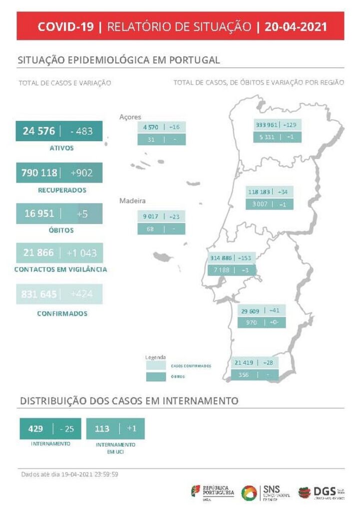 Na região do Algarve o boletim de hoje revela que foram registados 28 novos casos, acumulando-se 21.419 infeções e 356 mortos.