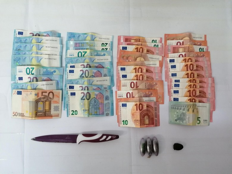 A PSP apreendeu 67 doses individuais de haxixe; 635,00 € em numerário e uma faca de cozinha destinada ao corte de produto estupefaciente.