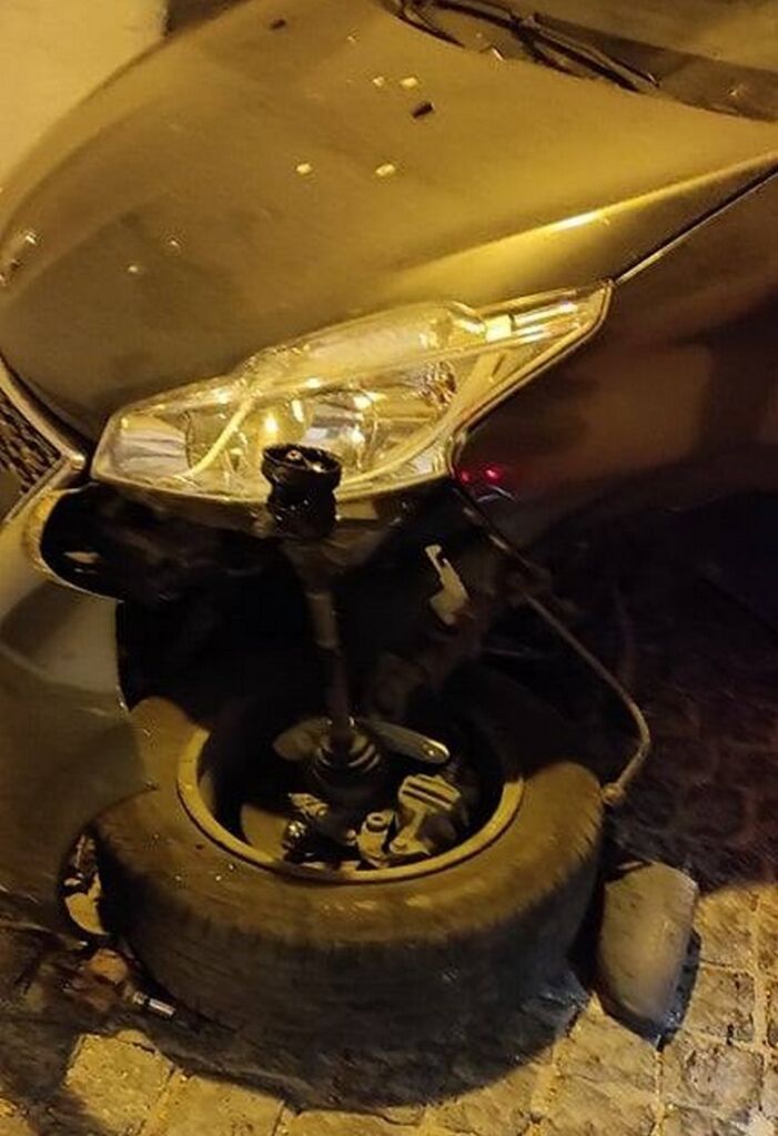 O embate provocou danos avultados, tendo danificado o eixo da viatura, que liga a roda e o chassis, ficando ainda vestígios de óleo derramado nos paralelos da via.