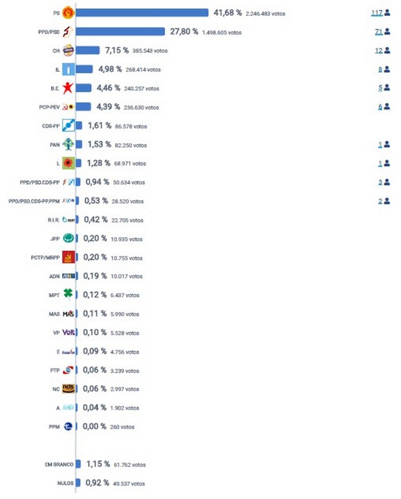 O PS venceu as eleições legislativas de domingo com maioria absoluta com 41,6% e 117 deputados, segundo os resultados provisórios da Secretaria-Geral do Ministério da Administração Interna.