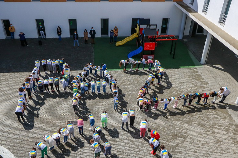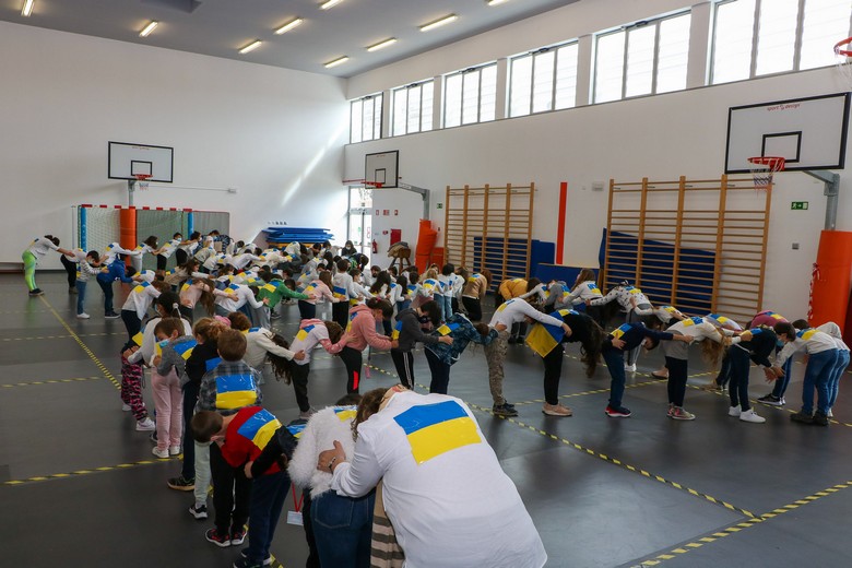 No espaço do recreio, os envolvidos, envergando indumentária branca com a bandeira da Ucrânia colocada na espalda, formaram a palavra ‘PAZ’, acompanhada pelo logotipo que simboliza isso mesmo: a paz. Paz essa tão necessária para repor a tranquilidade do dia-a-dia a nível mundial.