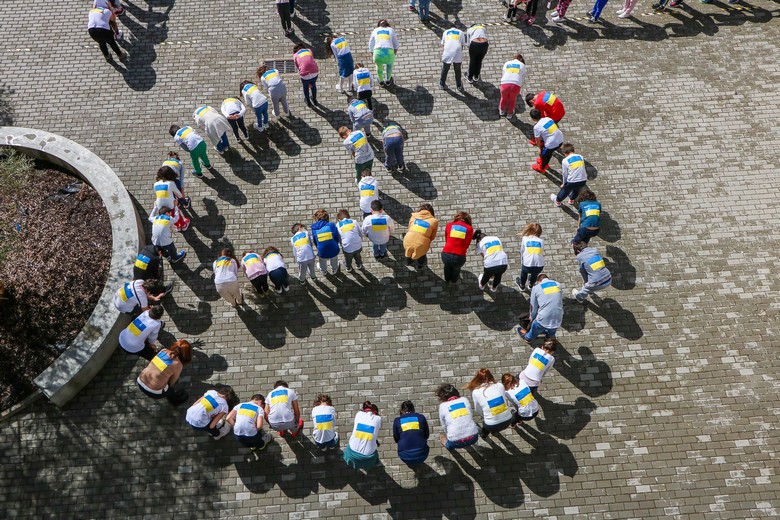 Turmas do Agrupamento de Escolas de Arronches em ação simbólica de apoio à população afetada pela situação do leste da Europa.