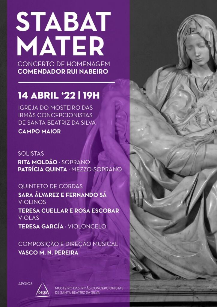 Com composição e direcção musical do maestro Vasco Pereira, o concerto de música sacra “Stabat Mater” conta com a participação de Rita Moldão (soprano), Patrícia Quinta (mezzo-soprano), Sara Álvarez e Fernando Sá (violinos), Teresa Cuellar e Rosa Escobar (violas) e Teresa García (violocelo).
