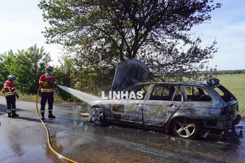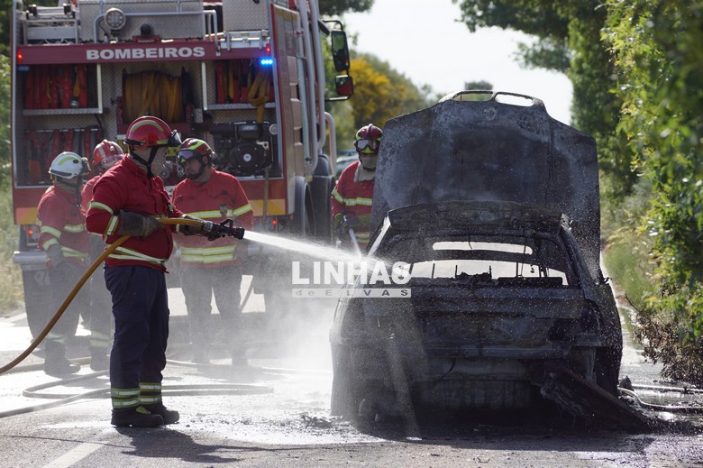 As chamas destruíram por completo um automóvel que circulava na Estrada Nacional 372, no sentido Vila Fernando-Santo Aleixo, no concelho de Elvas.