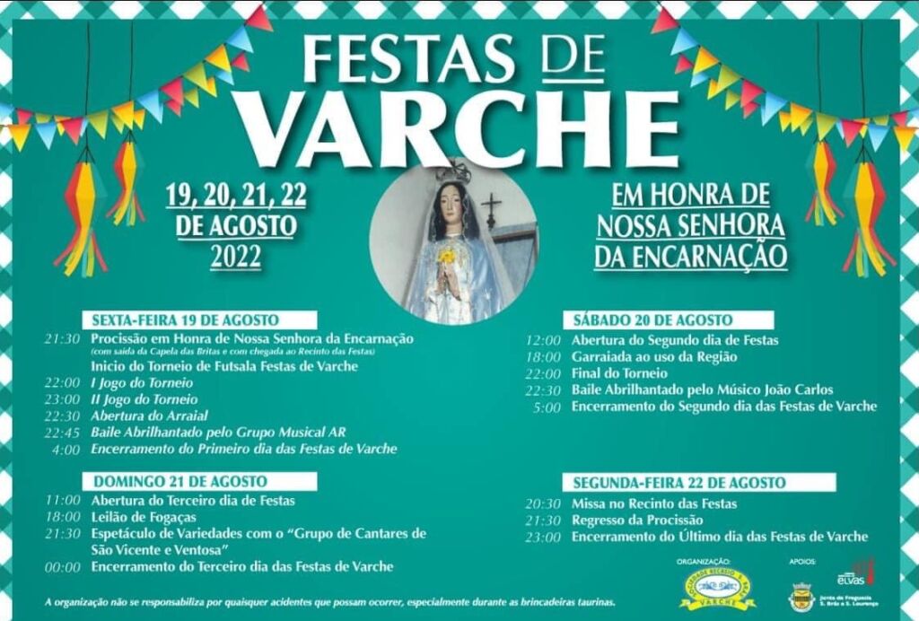 As comemorações religiosas são em honra de Nossa Senhora da Encarnação. No decorrer dos dias, realizar-se-ão garraiadas, torneio de Futsala, leilões de fogaças, espectáculos de variedades, seguidos de baile terminando com missa e o regresso da procissão, este ano somente com o andor dedicado a Nossa Senhora devido ao restauro das imagens de São José e de São Brás, o santo devoto da Freguesia a que Varche pertence.