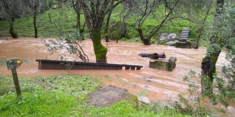 O temporal da última noite deixou algumas marcas no concelho de Alandroal. Uma das mais visíveis foi a queda da ponte de madeira sobre a Ribeira do Lucefecit, junto à Rocha da Mina (Foto Vicente Arrifes