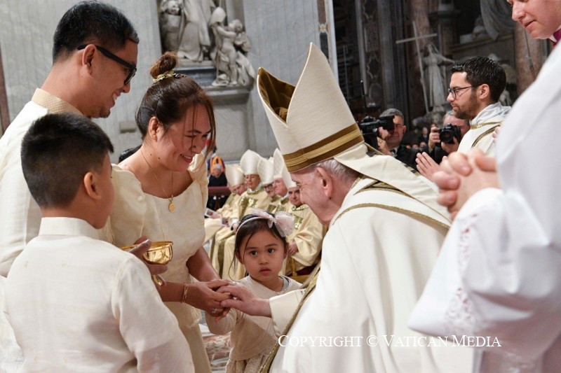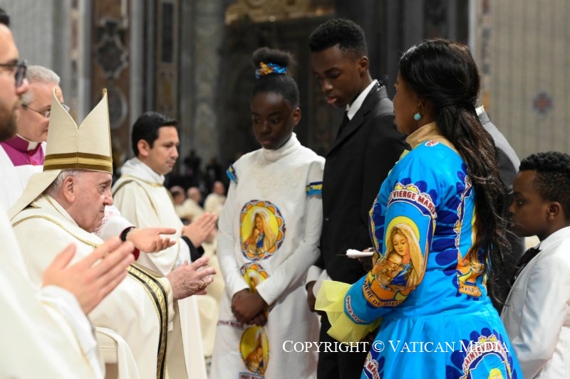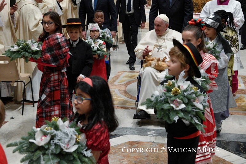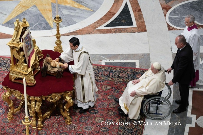 Um diácono destapou pelo Papa a imagem do menino Jesus, enquanto crianças provenientes de várias partes do mundo depositaram ao seu lado umas flores e na Praça de São Pedro soaram as campainhas para anunciar o nascimento de Jesus.