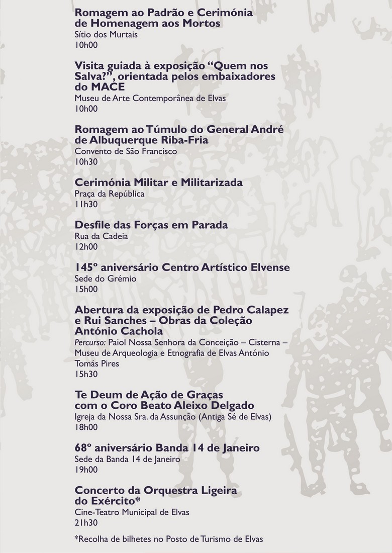 Meia hora depois, no Sítio dos Murtais, decorre a romagem ao Padrão comemorativo da Batalha das Linhas de Elvas e cerimónia de Homenagem aos Mortos, e, pelas 10.30 horas, a romagem ao Túmulo do General André de Albuquerque Riba-Fria, no Convento de São Francisco. As cerimónias militares e militarizadas, na Praça da República, têm início pelas 11.30 horas, seguindo-se pelas 12 horas, o desfile das Forças em Parada, na Rua da Cadeia.