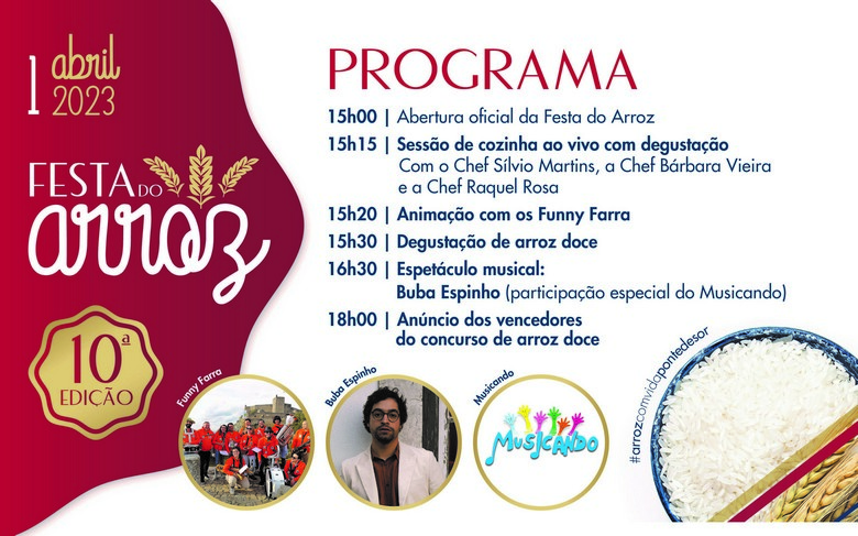 A 10.ª edição da Festa do Arroz, em Ponte de Sor, vai decorrer no sábado, dia 1 de Abril, a partir das 15 horas, com apontamentos de cozinha, doçaria e actuações musicais.