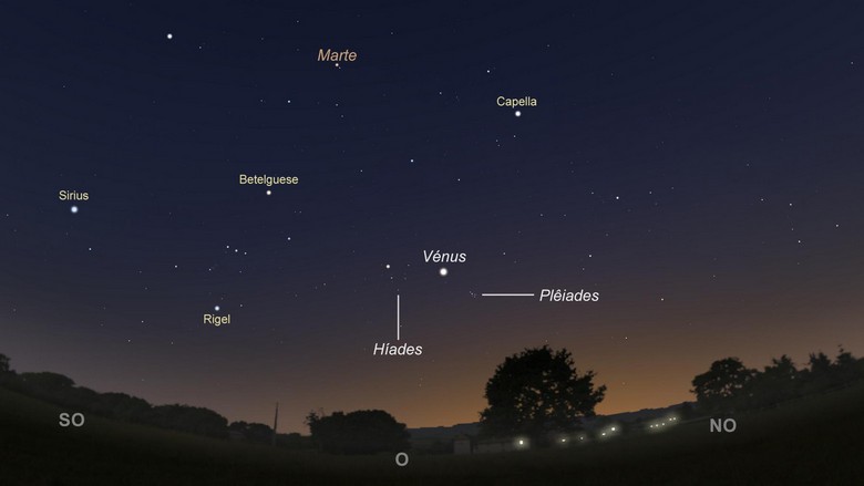 Visíveis à direita de Vénus, as Plêiades, ou objeto Messier 45 (M45), são um enxame de estrelas aberto, dos mais próximos do Sistema Solar, situado a cerca de 450 anos-luz. A olho nu, este enxame tem entre 7 e 10 estrelas visíveis (conforme a qualidade do céu e a capacidade dos vossos olhos).