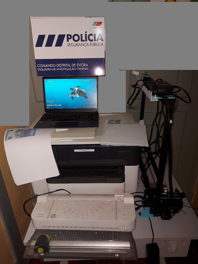 A fonte da PSP de Évora disse que também utilizaram uma impressora multifunções para imprimir notas falsas em folhas de papel simples e guilhotinas para as cortarem à medida para destrocar ou pagar compras.