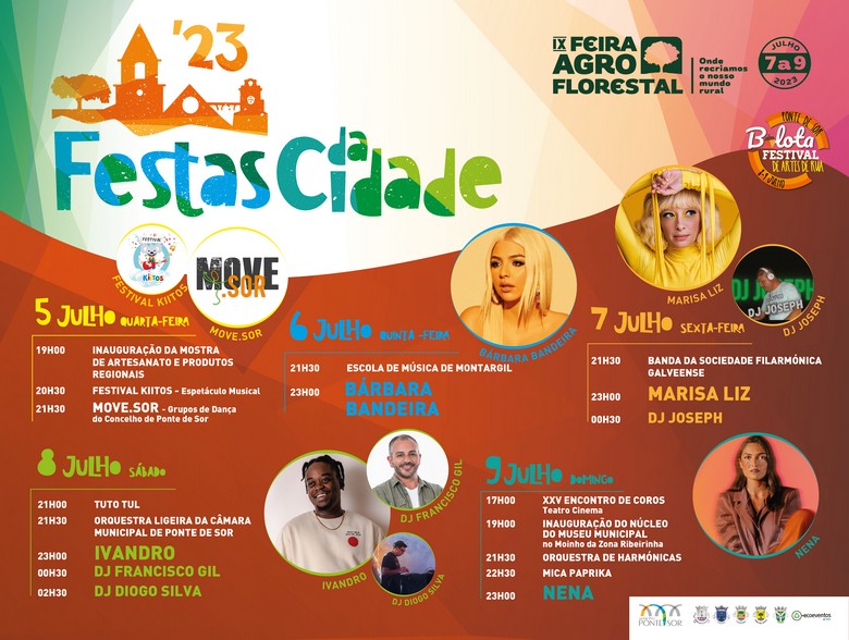 No sábado, 8 de Julho, dia em que se assinalam os 38 anos da elevação de Ponte de Sor a cidade, os espectáculos musicais vão ter início pelas 21 horas, com as actuações de Tuto Tul, espectáculo de artes de rua, seguindo-se a actuação da Orquestra Ligeira da Câmara Municipal de Ponte de Sor.