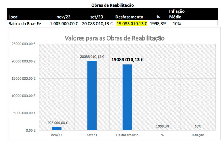 - Discrepância relativamente ao investimento nas obras de reabilitação, para as soluções habitacionais, verificada entre os valores apresentados em 2022, no aditamento de novembro de 2022 e na posterior alteração, em 2023.