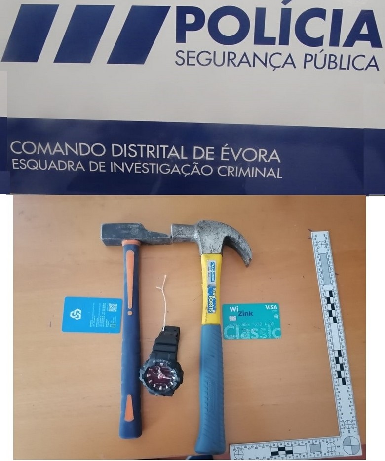 Em comunicado, o Comando Distrital de Évora da PSP indicou que agentes da esquadra de Investigação Criminal apreenderam ainda os martelos que terão sido utilizados para partir o vidro da montra da ourivesaria.