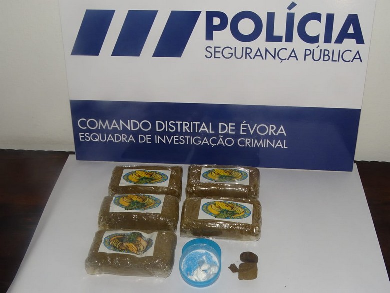 Dois homens, de 39 e 21 anos, foram detidos em flagrante delito em Évora, por suspeitas de tráfico de droga, tendo sido apreendidas 1.016 doses de haxixe e seis de cocaína, revelou a PSP.