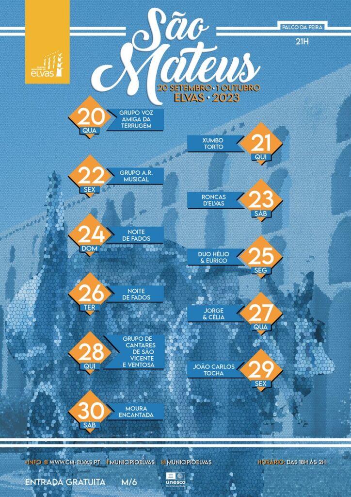 Amiga (20); Xumbo Torto (21); A. R. Musical (22), Roncas D’Elvas (23); Noite de Fados (24); Duo Hélio e Eurico (25) e Noite de Fados (26). Actuam ainda neste palco o Duo Jorge e Célia (27), Grupo de Cantares de São Vicente e Ventosa (28), João Carlos Tocha (29) e Moura Encantada (30), a partir das 21h00.