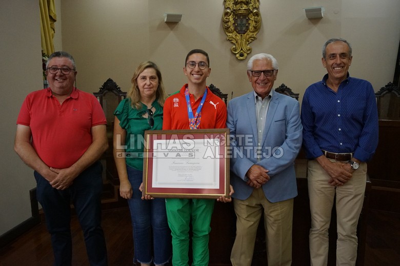 O atleta elvense duplamente medalhado com prata no Campeonato Europeu de Atletismo para Surdos, Francisco Laranjeira, foi homenageado com a entrega do voto de louvor, esta segunda-feira, pelo Município de Elvas, numa cerimónia que decorreu no Salão Nobre dos Paços do Concelho.