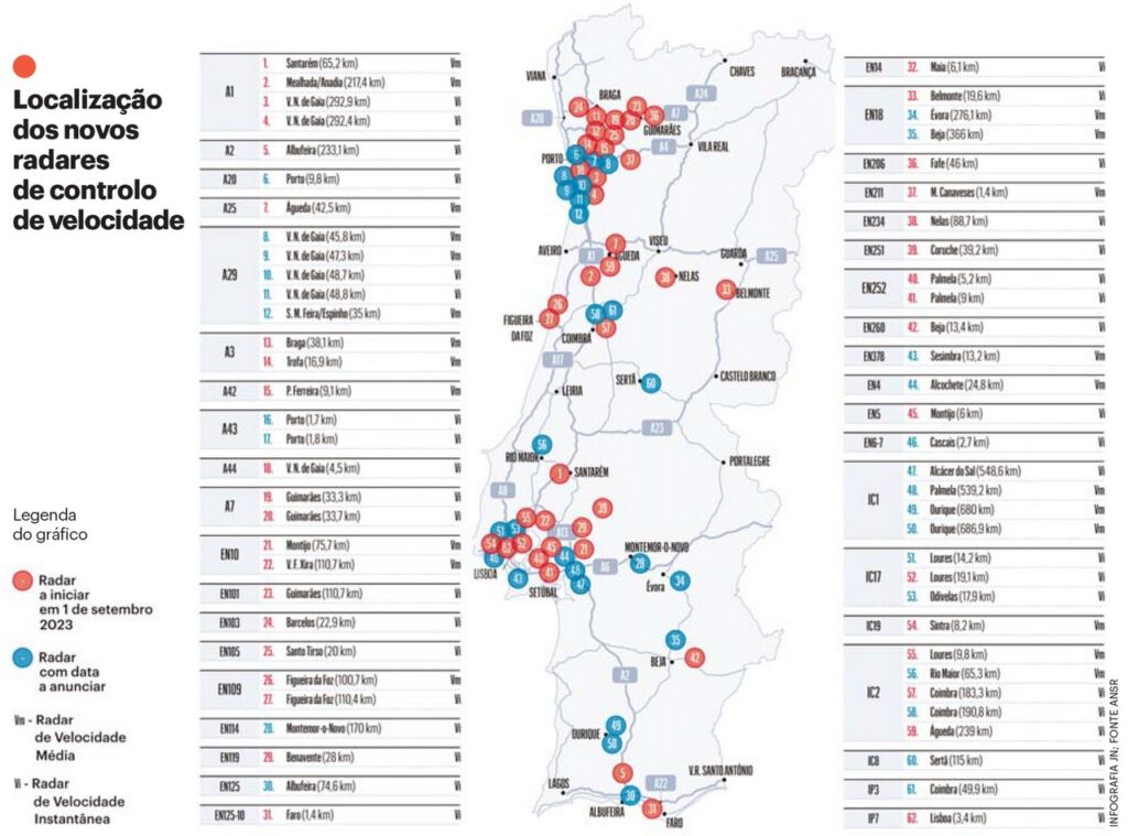 Entre os locais controlados a partir de hoje estão: A1 (dois em Vila Nova de Gaia), A2 (Albufeira), A44 (Vila Nova de Gaia), A7 (dois em Guimarães), EN101 (Guimarães), EN103 (Barcelos), EN105 (Santo Tirso), EN109 (Figueira da Foz), EN119 (Benavente), EN125 (Faro), EN14 (Maia), EN18 (Belmonte), EN206 (Fafe), EN234 (Nelas), EN251 (Coruche), EN252 (dois radares em Palmela), EN260 (Beja), EN5 (Montijo), IC17 (Loures), IC2 (Coimbra e Águeda) e IP7 (Lisboa).