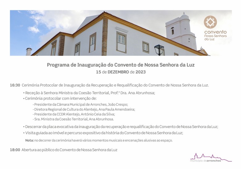 A cerimónia de inauguração da recuperação e requalificação do Convento de Nossa Senhora da Luz, em Arronches, está marcada para sexta-feira, dia 15 de Dezembro, pelas 16,30h.