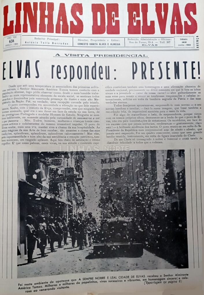 “Desde que sob uma temperatura já anunciadora das primeiras ardências estivais, o Senhor Almirante Américo Tomás tomou contacto com a população elvense, logo pôde observar como, desde o mais humilde trabalhador ao mais representativo elemento da escala social, se sentiram todos atraidos e dominados pela venerada presença do ilustre e mais alto Magistrado da Nação. Foi, na verdade, uma recepção coroada pelo triunfo.
