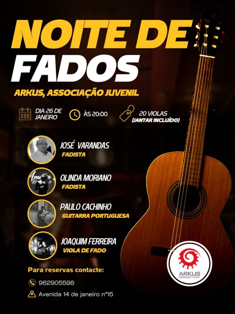 A associação juvenil Arkus, de Elvas, organiza uma noite de fados no próximo dia 26 de Janeiro, pelas 20 horas, na sua sede situada na Avenida 14 de Janeiro.
