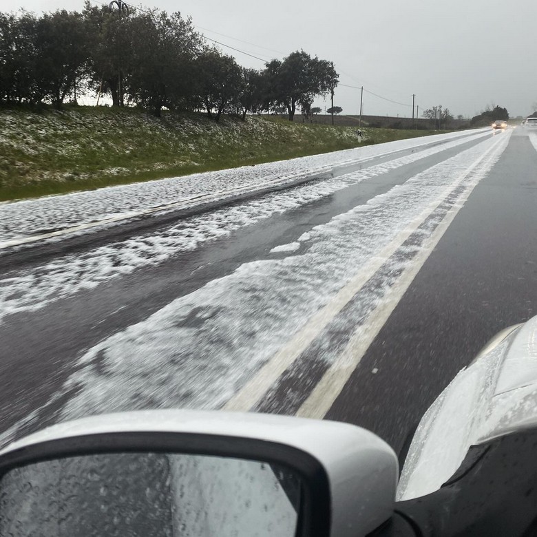 A queda de granizo em Alandroal e em Vila Viçosa pintou a paisagem de branco, tal como a A6 e a EN4, junto a Borba e Estremoz.