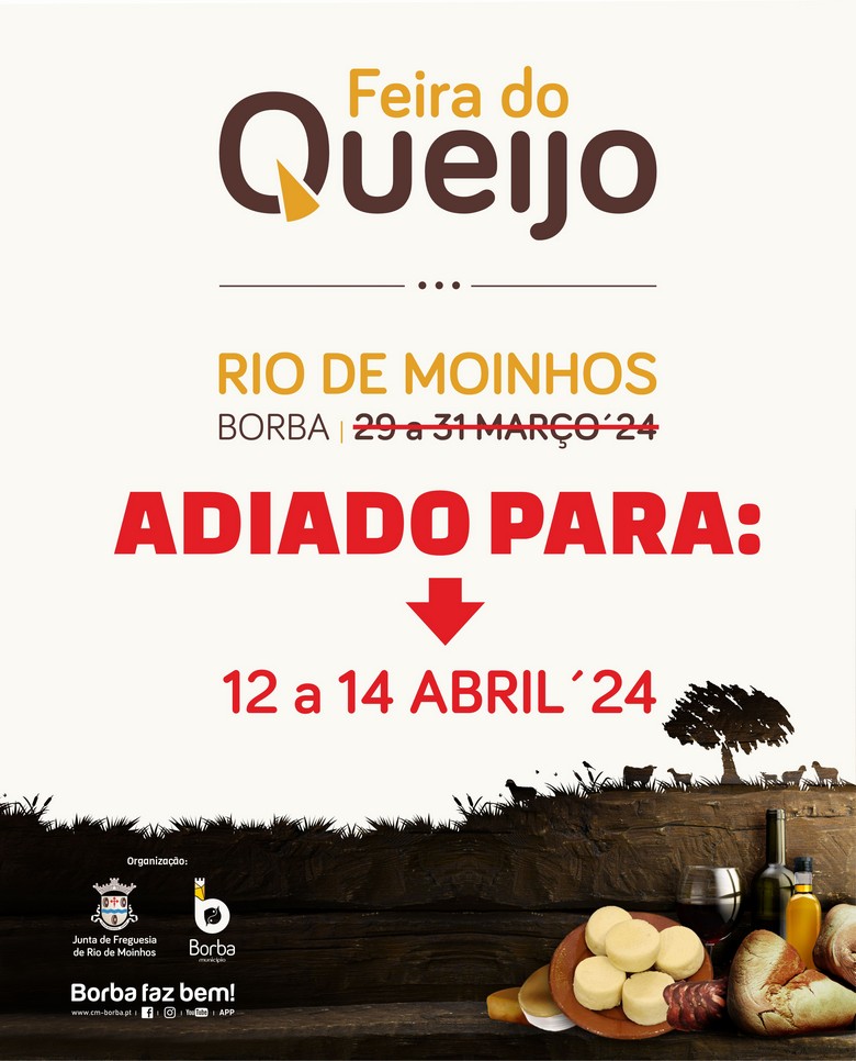 A Feira do Queijo em Rio de Moinhos, no concelho de Borba, foi adiada para o fim-de-semana de 12, 13 e 14 de Abril, informou o Município.