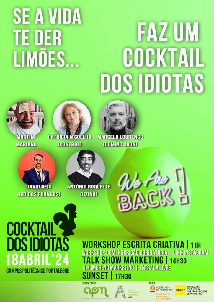 Após um longo intervalo, a licenciatura de Administração de Publicidade e Marketing organiza este ano mais uma edição do Cocktail dos Idiotas, que irá decorrer no dia 18 de abril de 2024, entre as 11h e 20h, na Escola Superior de Tecnologia, Gestão e Design, no Instituto Politécnico de Portalegre.