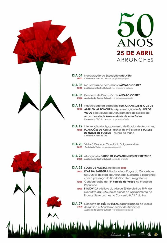 No dia 25 de abril, Arronches assinala o 50.º aniversário da Revolução dos Cravos com a solta de pombos no Rossio, pelas 9h00, um ato simbólico de paz, seguida do içar da bandeira nacional nos Paços do Concelho e nas Juntas de Freguesia de Assunção, Mosteiros e Esperança, acompanhada pela Banda da Sociedade Recreativa Musical Alegretense. Ainda nesta manhã, a Praça da República, no centro da vila, recebe a concentração do 11.º Passeio de Vespa e, pelas 16h00, o Convento de Nossa Senhora da Luz será palco da iniciativa BIBLIOVIDA, com a leitura da Ata de 25 de Abril de 1974 do executivo da CMA pelos alunos do Agrupamento de Escolas de Arronches.