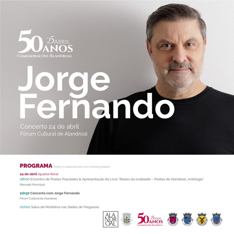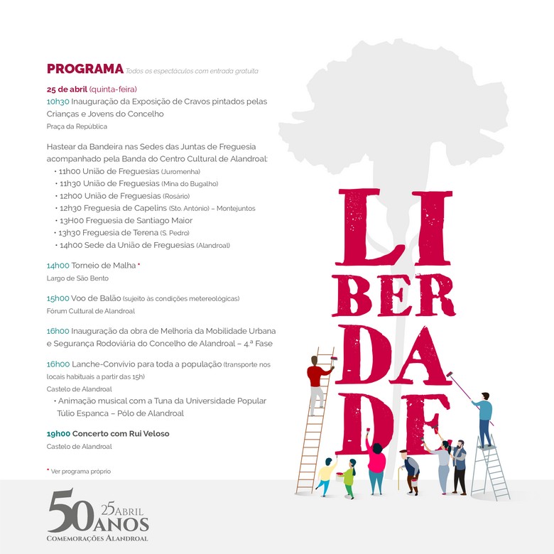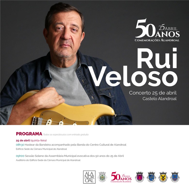 As comemorações prolongar-se-ão pelo concelho e suas freguesias ao longo do ano, mas não deixaremos de assinalar o dia 25 de Abril como o mais importante destes 50 anos. Com uma Sessão Solene da Assembleia Municipal seguida do Hastear da Bandeira por todas as freguesias, a tarde ficará marcada pela inauguração da obra de Melhoria da Mobilidade Urbana e Segurança Rodoviária – 4a fase, o lanche-convívio para toda a população e ao fim da tarde o concerto com Rui Veloso.