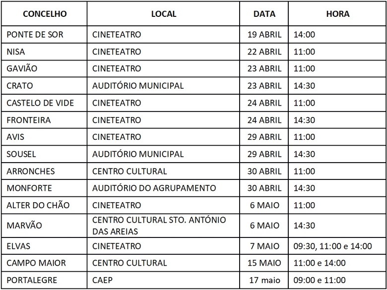 Durante o evento será apresentado um espetáculo que transpõe para o palco o conteúdo literário do livro, com cenários realizados pelos alunos, seguido da apresentação do making of com imagens registadas ao longo do processo, e que finalizará com a entrega do livro aos seus autores. O evento de lançamento terá apresentações nos concelhos envolvidos, conforme calendário que abaixo se apresenta.