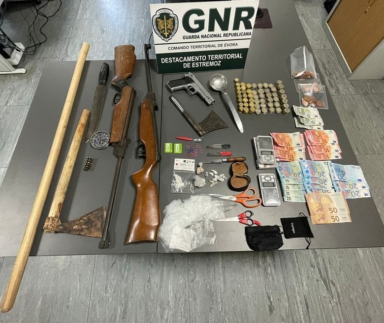 Além da droga, a GNR apreendeu 12 munições de diversos calibres, quatro armas brancas, duas armas de ar comprimido, uma arma de ‘airsoft’, 820 euros em numerário e diverso material relacionado com o tráfico de estupefacientes.