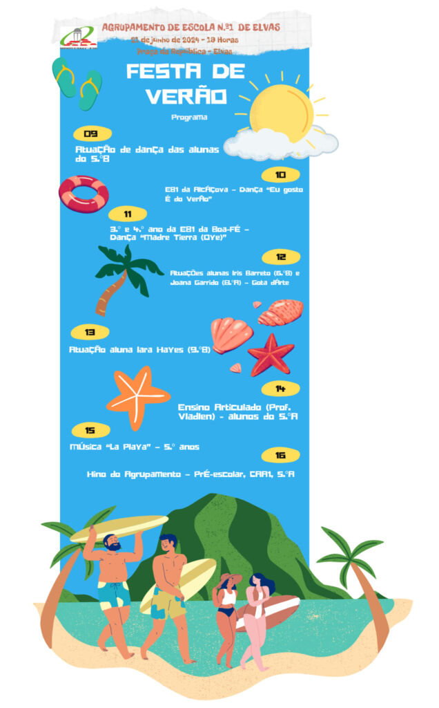 O Agrupamento de Escolas nº 1 de Elvas termina o ano escolar com uma Festa de Verão dia 21 de Junho às 19h00 na Praça da República.