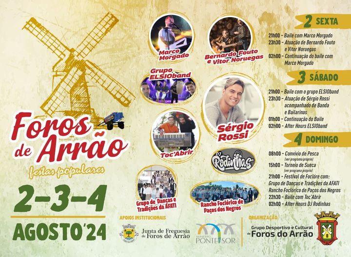 O programa está recheado de espectáculos musicais. O destaque vai para a atuação do cantor Sérgio Rossi, sábado dia 3, às 23h30 e para o Festival de Folclore, domingo às 21h00.