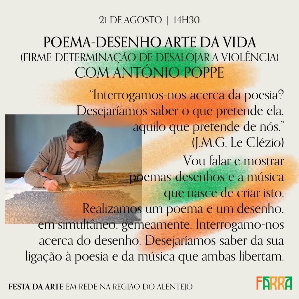 António Poppe constrói uma explicação à volta do tema “Poema Desenho Arte da Vida (Firme Determinação de Desalojar a Violência) e demonstra as conexões entre poesia, desenho e música.
