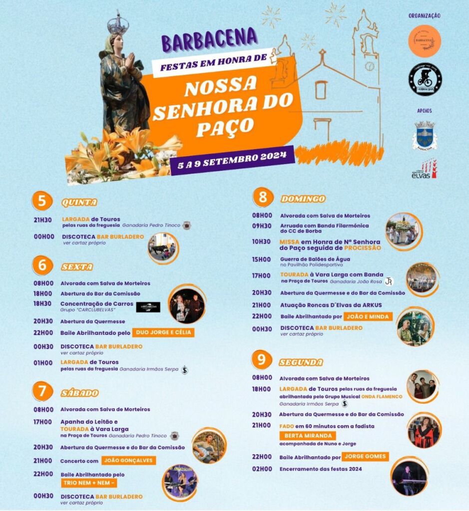 O programa inclui espetáculos taurinos, quermesses, bailes, concerto com João Gonçalves, fados e as cerimónias religiosas marcadas para domingo, dia 8. A Banda Filarmónica de Borba chega pelas 9h30 e acompanha mais tarde a Procissão que sai da Igreja depois de ser celebrada a Missa, marcada para as 10h30.
