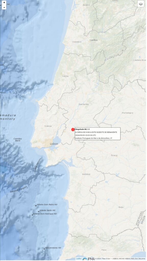 O Instituto Português do Mar e da Atmosfera informa que no dia 04-09-2024 pelas 00:03 (hora local) foi registado nas estações da Rede Sísmica do Continente, um sismo de magnitude 1.9 (Richter) e cujo epicentro se localizou a cerca de 8 km a Este-Sudeste de Benavente.