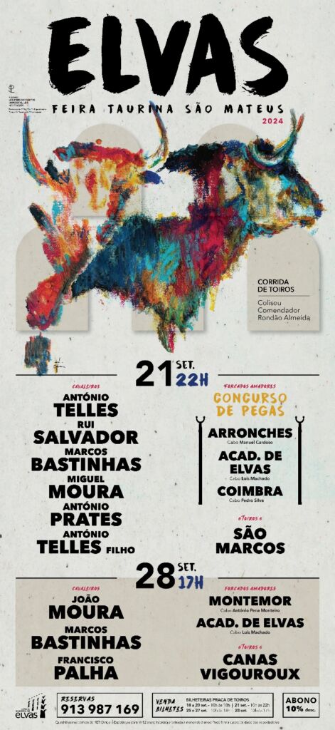 A 28 de setembro, pelas 17h, serão lidados toiros de Canas Vigouroux pelos cavaleiros João Moura, Marcos Bastinhas e Francisco Palha. Pegam os Forcados Amadores de Montemor e Académicos de Elvas.