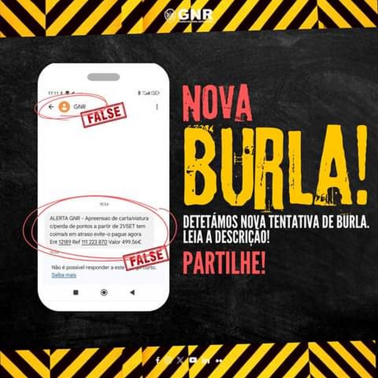 A Guarda Nacional Republicana detectou uma nova mensagem a circular, “cujo emissor, desta vez, se apresenta, falsamente, como GNR”, em que o receptor é informado de que “a sua carta de condução consta para apreensão com perda de pontos”: para o evitar, é fornecida uma entidade, referência e valor para pagamento.