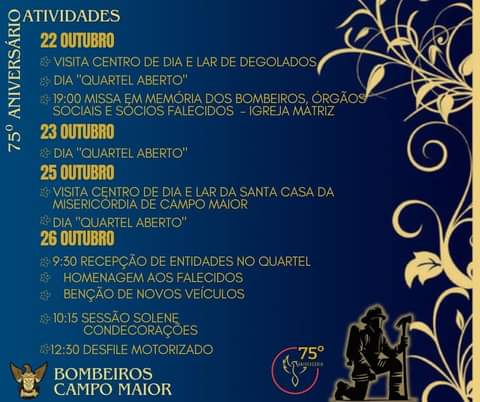 Esta terça-feira, 22 de Outubro, foi dia do aniversário “diamante” para a Associação Humanitária dos Bombeiros Voluntários de Campo Maior: “são 75 anos ao seu lado, ao lado dos campomaiorenses, ao lado dos portugueses”.