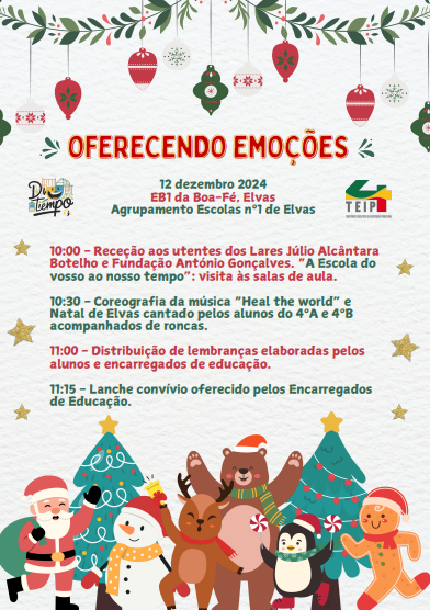 Às 10h30 é feita a apresentação de uma coreografia da música “Heal of the World”. Segue-se o Natal de Elvas cantado por alunos do 4º ano, acompanhados de roncas.