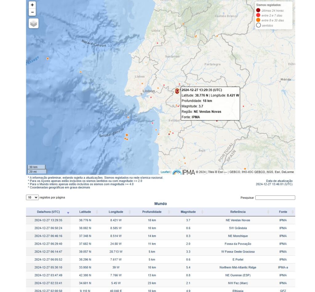 Um sismo de 3,7 na escala de Richter foi registado esta sexta-feira, 27 de Dezembro, na zona de Vendas Novas.